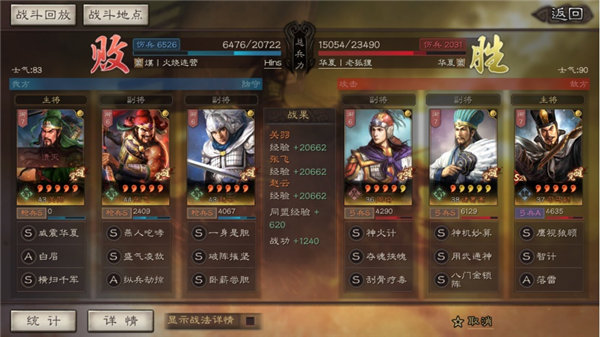 关张赵队虽然兵力和士气稍占劣势,但等级和武将进阶都全面优于国之栋才队。