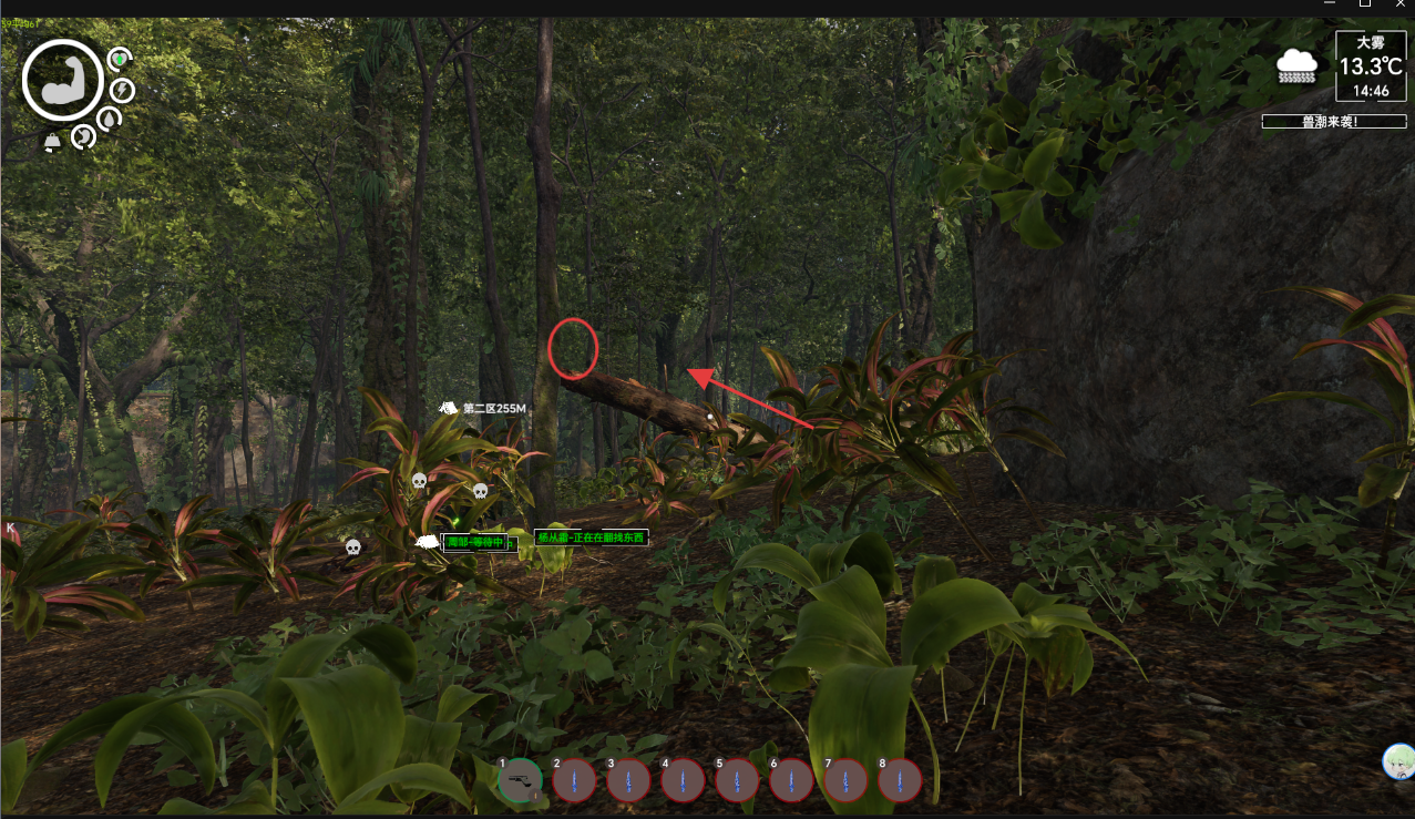 可以看到我们站在枯木上面是打不到的 注意!!!上枯木时不能让精英九号尾随在后面不然它会沿着我们的轨迹上到枯木上
