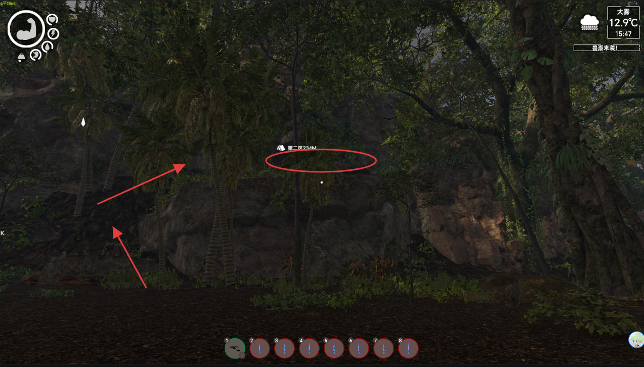 三十一号很简单哈,我们直接找到这个地方 就在怪物刷新点周围 一块岩石旁边一根接近80度插在地面的枯木,枯木不用跳直接可以走到最上面,
