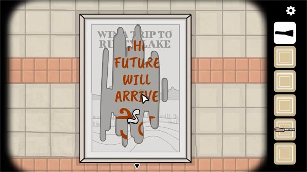 5、在婴儿车旁边的场景里有一张海报,用铲子把海报刮烂,就看到“THE FUTURE WILL ARRIVE”,也就是未来即将到来的意思。然后海报底部会出现一个神秘符号。