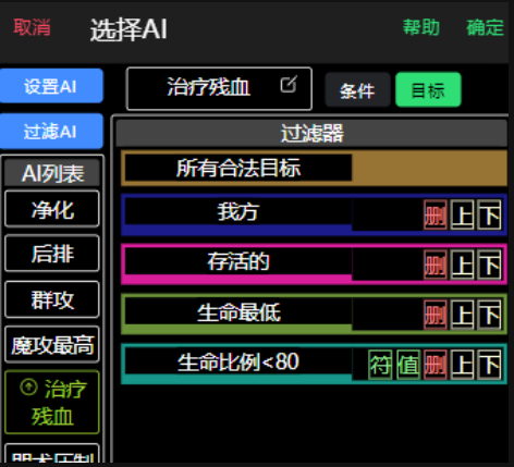 游戏前10大关是不要强制设置任何策略的,队伍保持1坦克1奶妈3输出或者辅助即可进行,内置的默认策略就可以凑合用。但本阶段萌新们会发现奶妈经常会对满血角色加血,效率很差,这时候建议对奶妈写第一条策略,加一条[治疗术+治疗残血]的策略,设置对[生命比例<60%]的角色使用技能(数字随自己喜欢)。