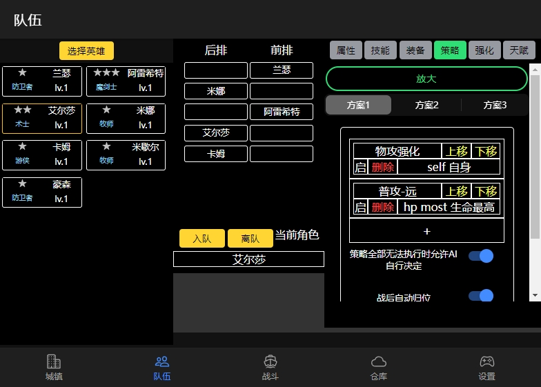 10关以后,怪物会开始击退坦克,配合部分怪物高伤害的死刑技能(例如突袭等,前排没有坦克时,10倍伤害)直接团灭队伍,并且很长一段时间困扰萌新们,这时候可以针对性的给坦克添加一条当自身在后排时移动到前排的ai。(不用怀疑,就这么简单,因为前进技能只能在后排放)