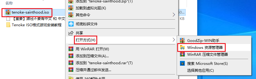 1、在本站下载安装包并解压,右键点击tenoke-sainthood.iso文件,打开方式——Windows 资源管理器。