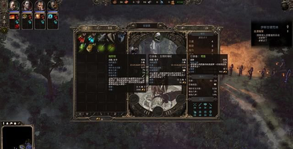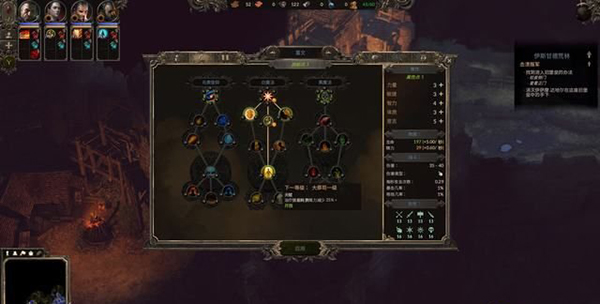 单击屏幕正下方选项键可查看当前英雄的人物信息,包括装备,属性分配,技能树,咒术书(显示技能生效后的增益效果)及当前任务目标(任务栏也直接显示在屏幕右上方)。