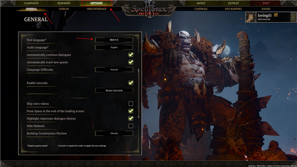 4、游戏默认界面还是英文,这里点击options—general—text language,设置为简体中文重启游戏即可;