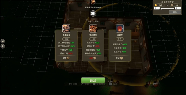 游戏中,随着季节的变化,每天都会有不期而遇的惊喜:绿树成荫的夏日可能迎来皇室下榻,而雪霜贸贸的冬日,厨师则会端上冬日特色菜单。在美丽的景色中与旅人们消磨四季,抓住每个发展机遇。