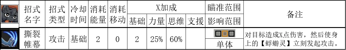 2、蜉蝣灵,这个技能会使具备此效果的友方角色,在行动结束后,随机发射一道以自身思维属性加成的能量波。触发蜉蝣灵的机制,需人物先拾取蜉蝣灵再攻击。如果攻击时无蜉蝣灵,攻击过后再拾取蜉蝣灵,则不会触发蜉蝣灵的攻击。