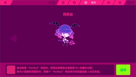 每当取得“Perfect”判定时,莉莉丝将帮助主角获得5%的额外分数;若与小恶魔玛莉嘉同行,则每个“Perfect”判定将为玛莉嘉回复2点生命值。