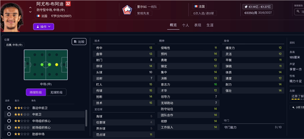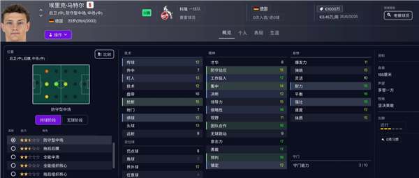 意志栏中意志力、工作投入和团队合作都是顶级,体质和耐力拉满,天生的B to B圣体,首推中前卫位置上的全能中场。
