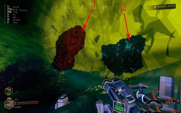 如下图箭头2所指,黑色的是墨菱石矿,这个就是任务所需的矿,你需要采集满100个。