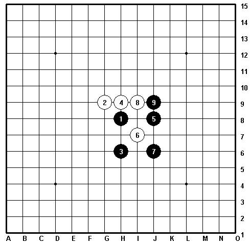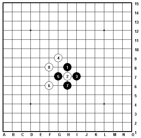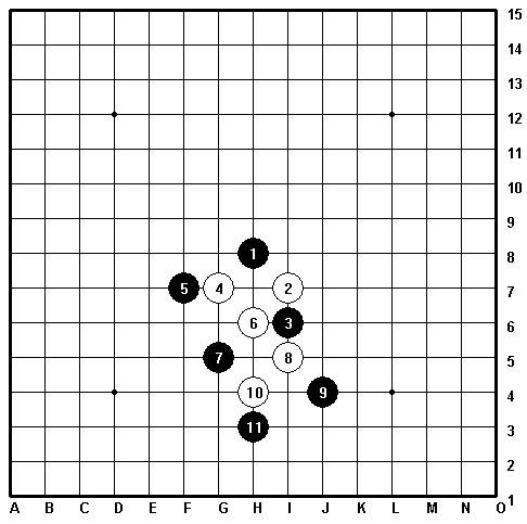 黑方四子呈四方形的摆布,因而得名。此阵多由明星、恒星、流星、金星、瑞星等开局演变而来。四角阵的特点是容易形成2、3支“剑”(棋语有云:三剑在手无不胜),局势利于向纵深发展。攻防的要点是夺先与反夺先,较少出现做棋的机会。在图五中,黑方的四角阵与白方的四角阵互相交错,称为双四角阵,是夺先与反夺先的典型。