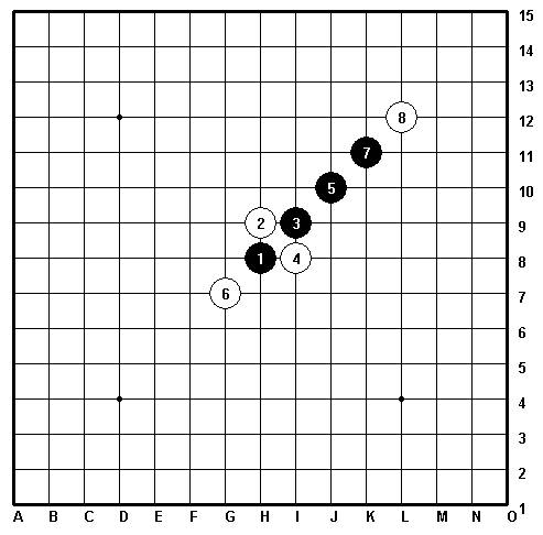 是典型的燕阵,白2为燕头、白8、6为双翅、黑9、7为尾翼,形态象展翅飞翔的燕子。燕阵也是变化极多的一种阵法,但大多是黑胜。有多种开局可演变出燕阵(有些可能要在十手之后才成形),多见于恒星、明星、流星。