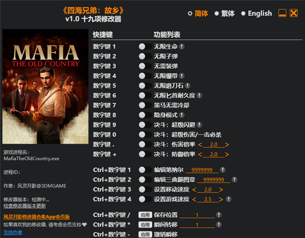 四海兄弟故乡修改器是一款专门为《四海兄弟:故乡》游戏所推出的游戏数值修改器,它内置十九项不同的修改功能,玩家将拥有无限生命值、无限弹药、马刺瞬间充能、隐身模式等设定,还可编辑迪纳里和特里纳克里亚,在决斗模式中有超级闪避和超级伤害加成,帮助玩家在残酷的西西里黑帮世界生存下去,参与各种近距离刀刃肉搏战和远距离枪械战,在托里西犯罪家族的权力漩涡中,揭开黑手党起源的残酷真相。