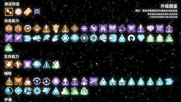4、角色特殊效果——部分升级能够赋予你的角色各种特殊效果,例如自动追踪导弹、回复能力、伤害反弹能力、子弹爆裂等,通过千变万化的角色特效组合打造出属于你自己的build!