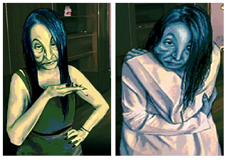 她身穿白色长袖睡袍,赤脚。她的脸色阴沉,但脸颊不像姐妹们那样松弛。她的头发又长又直,略带深蓝色。她的皮肤白皙,略带蓝色。她的指甲干净,没有涂指甲油。奇怪的是,她的虹膜是黑色的,而瞳孔却是蓝色的。