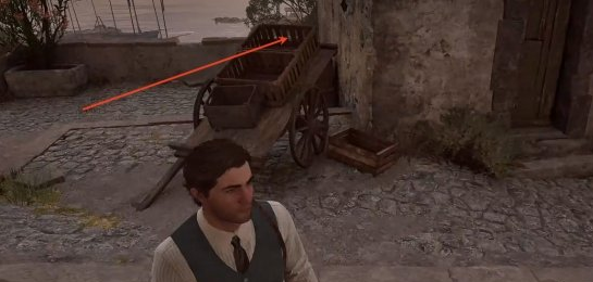 2、进入地图,报纸就在这个木质架子车后边的石凳上。