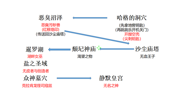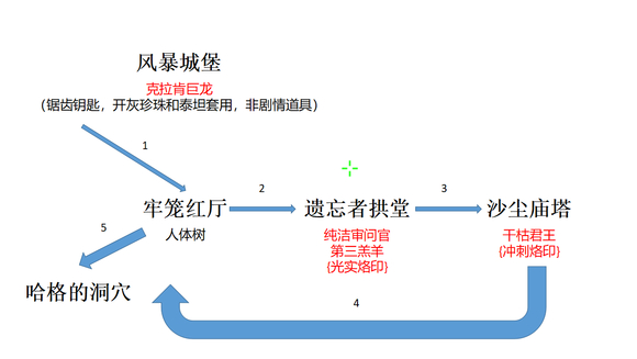 1、回到沙尘庙塔避难所后左走,来到手刀狗狗的地方往下探索,然后就是图示流程。
