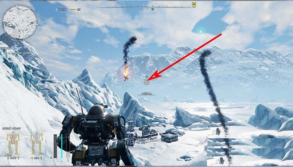 机甲的武器是有射高限制的,如下图箭头所指,这里就是机甲的准星,