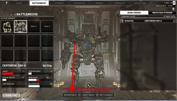战斗之后,你的机甲难免会损坏,进入机甲控制台,点击如下图箭头所指的修理按钮,