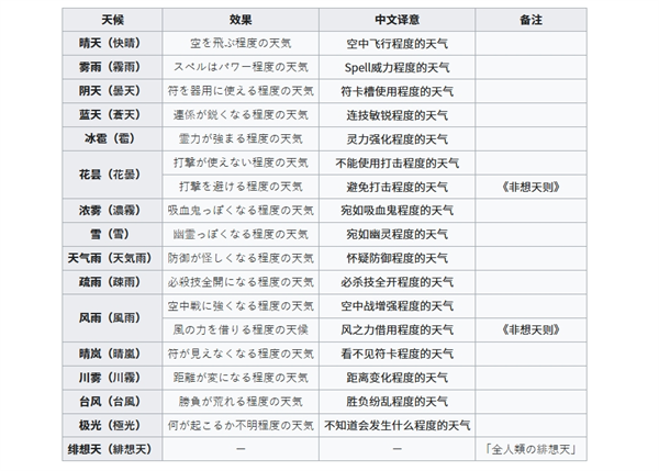 共有15种天候,不同的天候有不同的效果(最后第16种为特殊天候,仅出现于故事模式中);另《非想天则》中有所改变的天候效果一并列于此(《非想天则》新增的5种天候则见东方非想天则#天候)。