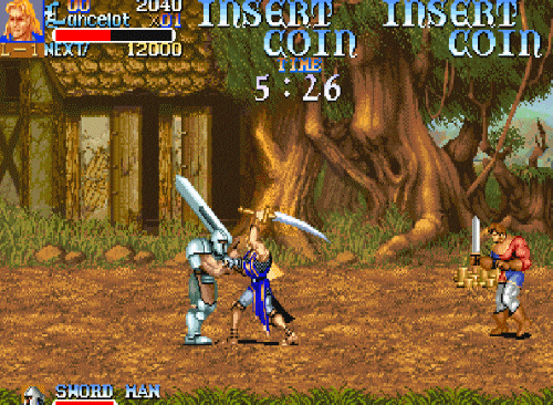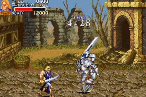圆桌骑士》里的攻击+↑指令飞踢飞踢攻击范围小、技能发动慢、一旦击中敌人,兰斯洛特还会来个后空翻,每次用完落地都很容易被一通暴揍,这么多缺点,难怪当年在街机厅完全没看到有人用,即便到了高手如云的联网时代,也依然成为被人所遗忘的技能。