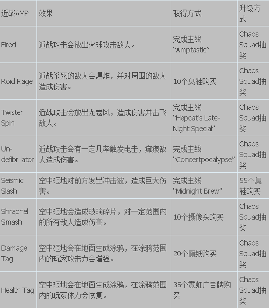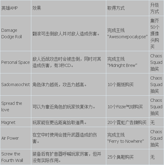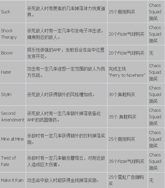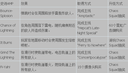 玩家可以在游戏中的藏身处找到 Floyd 来购买各种 Amps,而购买 Amps 的费用则是散布在 Sunset City 各处的收集物:包括 Fizzco 娃娃、卫生纸、(破坏)监视器、饮料罐商标以及挂在绳索上的臭鞋。某些 Amps 则必须要随着主线任务的剧情才能够取得,另外进行多人模式也有机会透过奖励来随机取得 Amps。