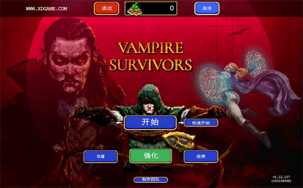 吸血鬼幸存者(Vampire Survivors)是一款具有roguelite元素的生存动作游戏,游戏语言已修改为简体中文,可以为国内玩家带来更好的游戏体验。游戏在画面上采用了简单的像素画风,画面虽然不太精致但是玩法十分丰富,可以为玩家带来很不错的游戏体验感!在吸血鬼幸存者电脑版游戏中,玩家控制一名主角在一张平坦的地图上迎战海量的敌人,主角技能都是自动发动,玩家只要控制角色走位、拾取敌人掉落的经验和金币、在升级时选择角色技能即可。游戏中有多个角色可以解锁选择,基本玩法相当的简单,几句话就可以解释清楚:所有的攻击都是自动的,你只需要控制角色移动,全程只需要按上下左右。游戏里敌人的数量多到能逼死密集恐惧症,同屏敌人100个以上完全是小菜一碟。吸血鬼幸存者游戏中除了角色多样化之外,还提供了超过20种不同的武器,10多种不同的装饰品以及各种各样的道具。玩家按照自己的喜好和策略最多装备六种武器和装饰品,如何有策略性的搭配,最终能产生怎样的效果,是我们需要考虑的内容,比如:威力强大的一件装备,我们可以考虑让技能的冷却时间变短等等非常有趣。