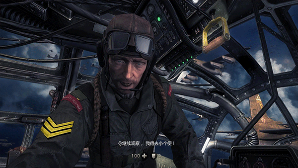 7.进入机舱内与怀亚特对话,BJ告诉他,在战场上要不就是执行命令要不就是死在战场上。然后走进秃鹰九号的驾驶舱,发现费格斯已经在控制着飞机,在他的背后蹲坐怀亚特,这小伙子虽然是空兵,但经历了此役之后,他不看再从机头位置观看风景。此时对怀亚特按X键,揪起他,扇他两巴掌,就可以让怀亚特冷静下来。