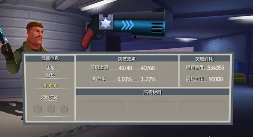 当武器升级达到某个等级时,等级会暂时封顶,导致武器无法继续升级。在这个时候,武器需要通过“突破”来获得额外的等级上限。武器的突破需要消耗游戏中的货币,以及与被突破武器相同的武器作为材料,来进行成功的突破。过突破,武器不仅可以获得额外的等级上限,并且还能够获得“增益率”方面的提升。