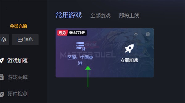 3、下载小黑盒加速器,然后找到masterduel决斗大师入库,不是加速哦,我们要注意选择区服是香港地区