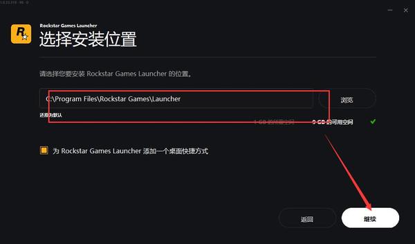 4、选择要安装 rockstart games launcher 的位置,这里选择的默认的位置并且勾选了为它创建一个快捷方式,点击"继续"安装就好啦。