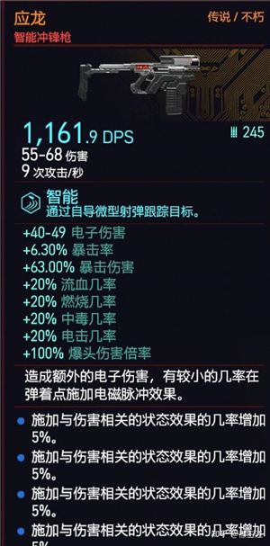 冲锋枪:【应龙】智能武器,应龙强在它的被动,有概率触发电磁脉冲(不是电磁短路),搭配其自身的高射速,触发电磁脉冲之后直接秒人。还有个bug,装了伤害增幅之后,居然无中生有加了4种负面效果,本来就很强了,新版不仅没有修复bug,还加了弹夹容量,喜欢玩智能武器的一定拿下它。获取方法-海伍德谷地区(市中心下方)罪犯窝点头目掉落配方。