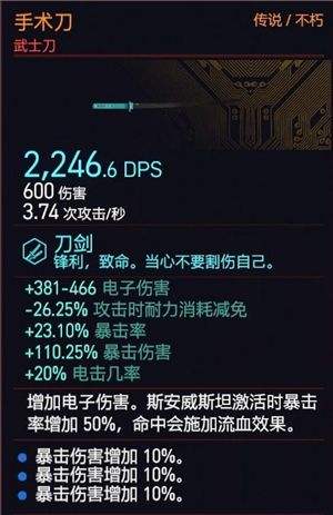 刀剑:【手术刀】配合时缓义体使用,相当于自带了50%暴击,不用刻意堆暴击就能满暴,而且电伤属性对绝大多数敌人都比较克制。在最终关卡里,会刷出几个血量超级厚的机甲,用平常的枪械和刀剑要打很多下,而用手术刀,一刀就能将其秒杀,还有成群出现的机器人,一刀即可秒掉一群。获取方法-来生酒吧,第一次见罗格的时候,罗格包厢对面站着的人那里接取支线任务“东瀛第一等”,任务奖励。(从通用性上,【手术刀】是极佳的选择,因为不用额外堆暴击,当然对于极限刀剑流派,手术刀仅为过渡选择,后期最强的刀剑还是【觉】)
