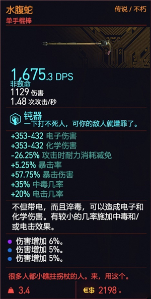 钝器:【水腹蛇】DPS最高的钝器,电伤+毒伤,在残血加狂暴状态下,一棒子能打出几十万伤害。是当前版本里武器输出的天花板,肉体流派必备近战武器。在人畜无害的外形下,藏着夜之城输出最暴力的能量。获取方式:第一次见指头哥时,在里屋沙发旁的桌子上拾取。
