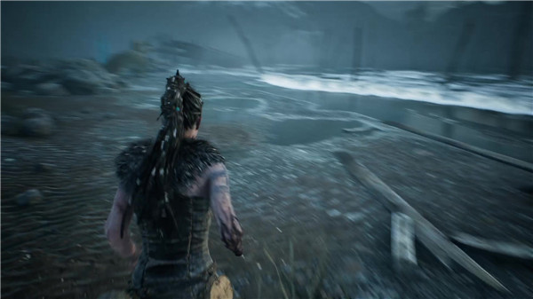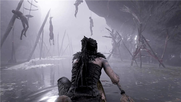 游戏开始,我们的女主角Senua划着独木舟,此时可以听到旁白和Senua脑海中不断出现的低语,这些碎碎念的低语会一直伴随着你在游戏中蹒跚前进(其实还挺烦的)。