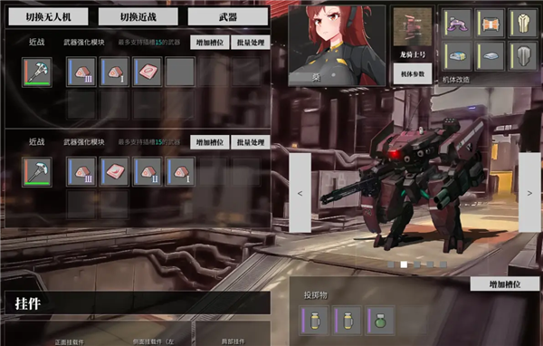 12+6武器槽,可以堆到15+9,一样可以装双速射炮,外勤主力二号,好用。另送6个投掷槽。轮式机动,跑起来速度很快,但步行→轮式或者轮式→步行转换需要一点点时间,需要注意。好感度提升可以降低每天的压力值,还会送治疗枪和治疗无人机。