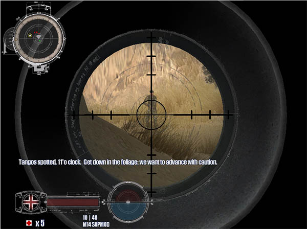 首先,你和队友降落在一片草原之上,先按F1看看地图,目的地就是前方的黄色圆圈。左前方有一个营地,我选择从地图左侧绕到此营地后面,F3切换到突击手(按G装上消音器)悄悄干掉帐篷内外两个敌人。继续从地图左侧的山坡前进,会看到一个塔楼,让狙击手干掉上面的哨兵。不要关瞄,继续干掉地面上若干个敌人。然后上桥会迎来第二个checkpoint,下桥后左侧二层楼上有一个哨兵干掉后,让狙击手站到左侧大道上,向黄色圆圈方向开瞄——三层楼顶有一个哨兵,比较远,暴头需要一定的技术。从左侧楼房后面向目标前进,注意随时F1观察地图(红色点是敌人)。敌兵清理干净后,爬到目标所在的楼顶会迎来第三个checkpoint。然后不急着下楼,切换到狙击手,配合F1干掉你所能看到的敌人。下楼让突击手带队向目标前进(中途会有4个追兵)。上桥来到直升机营地,进入后立刻躲进左侧的掩体,让突击手干掉扑上来的5个敌兵,继续前进并通过checkpoint后,让狙击手俯卧(Z)开瞄找到远处的两辆卡车,四周有几个敌人,可以练练狙击技术。全部清理后向目标前进,迅速爬到目标楼顶(楼内没有敌人),再解决此楼右下方停车场里的三个敌人。接下来,目标变成了实心园,意味着本关终点即将到来。突击手带队前进,到圆顶屋左转,会陆续冒出4个敌人。接下来你可直奔目标而去,不会有敌人了,当然也可以慢慢地走——欣赏一下海岸风景。到达两棵倒树处本关结束。