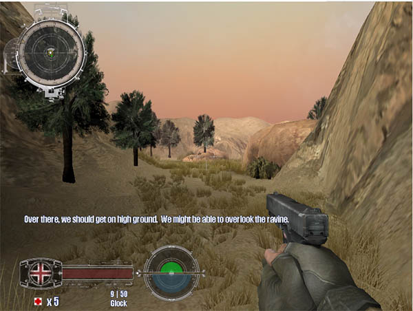 面前的直升机场里有6个敌兵,包括1号刺杀目标(经过第二关的洗礼,相信你可以轻松解决)。接下来直奔下一目标点---一个仓库,里面有4个士兵把守,解决后上梯子把阁楼里2号刺杀目标做掉(直接向里面扔雷更方便)。接下来经过拱形桥洞来到一片危房处,使用突击手装上消音器,此处有6个分散的巡逻兵,可以各个击破,然后上到二楼干掉3号刺杀目标(建议用雷,不要正面攻击)。出来沿斜坡上公路,贴着右手的围墙走,不难找到围墙的的入口,这里只有一个哨兵和4号刺杀目标,轻松解决。出来接着沿着右手边围墙走,上到公路后使用狙击手俯卧干掉对面“宫殿”二层的哨兵,右边最高的塔楼上还有一个别忘了。来到目标点——“宫殿”的围墙缺口,切换到突击手,装满弹药,准备迎接一场恶战。注意不要过于恋战,边打边向实心黄圈处跑,到达后本关结束。