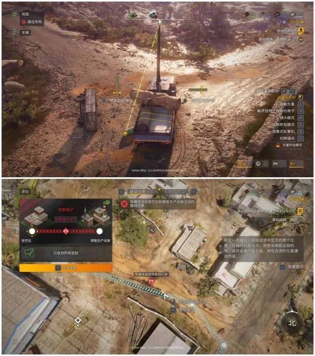 游戏里最主要的一种任务叫“基础设施:路径”,即为不同的区间规划一条方便各类车型来往运输的路段,这就需要我们研究整段路的路况,将各种会卡死车队的阻碍及时清理。不过来回开车属实有些麻烦,所以我这里有个取巧的方法。游戏的地图是非常精细的,每块巨石都能看得特别清晰,所以直接根据放大的地图规划路线就可以,自动生成的车队会按照这个路线进行移动,一旦发现哪个地方不动了,就证明这部分路况有问题,我们再把需要用到的机械都开过去,可以节省不少时间;因为有些路段虽然泥泞或有积水,但可以通过踩边的方法通过,这种能过去的路我们能不修就不修。