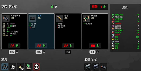 5、收集材料以获得经验并在敌人的浪潮中从商店中获取物品。