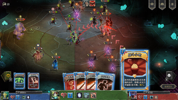 游戏核心围绕着牌组构建和快节奏的回合制卡牌策略对战。玩家需要合理利用牌组和怪物的位置变化来制定策略,只看一个角色的话总体玩法和杀戮尖塔差不多。