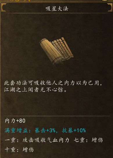 3、戏内有丰富的武功秘籍和内功心法可供学习修炼,提升角色的臂力、根骨、悟性、身法等属性。
