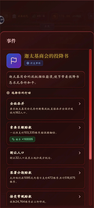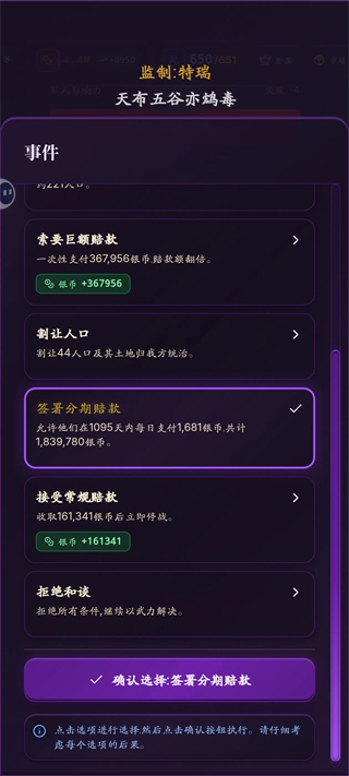 10、打仗过程中,其他国会来求和,全部拒绝(除非对面兵力高,再打下去打不过)。等战争分到350,出现吞并选项之后,就可以答应了。别选吞并!!!我们的目的是发战争财,把别的国家当血包养,一定要选分期付款。
