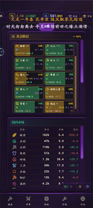 告别传统策略游戏的简单资源累积!这里有着复杂而真实的供需机制、动态价格波动、产业链联动。粮食、木材、铜矿、香料、咖啡、钢铁……20余种资源相互关联,市场的每一次波动都可能决定国运兴衰。