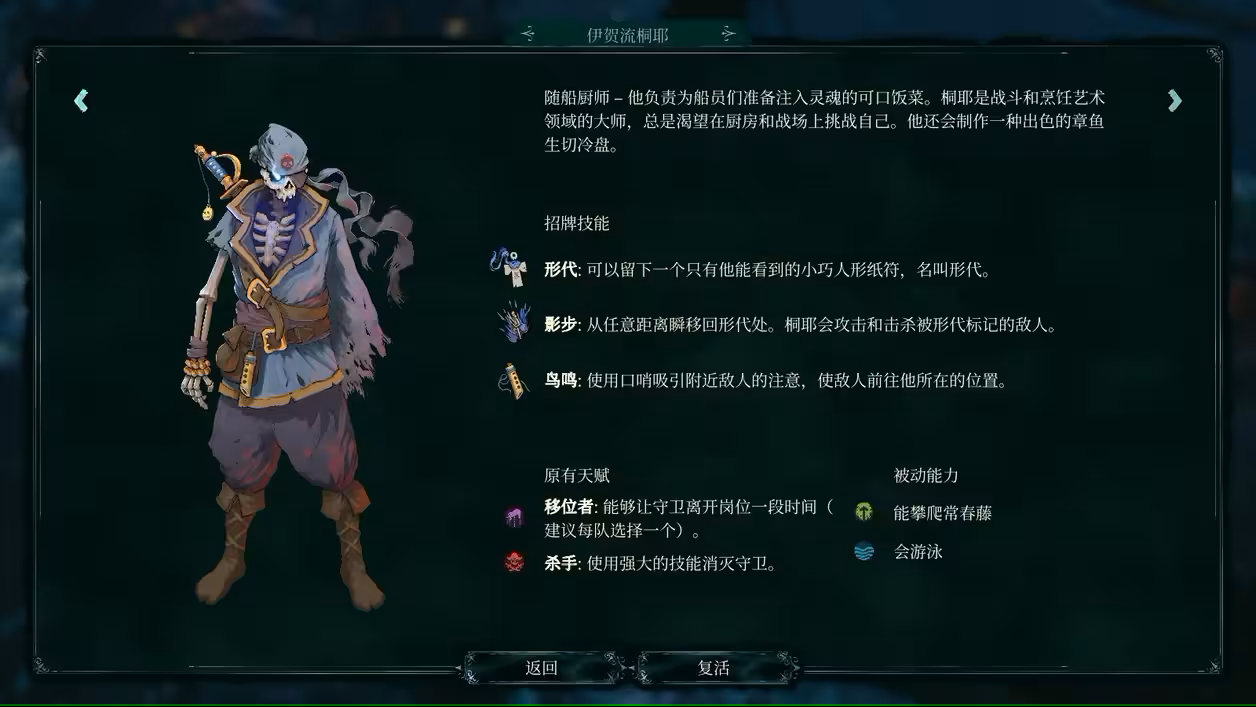 随船厨师,他负责为船员们准备注入灵魂的可口饭菜。桐耶是战斗和烹饪艺术领域的大师,总是渴望在厨房和战场上挑战自己。他还会制作-种出色的章鱼生切冷盘。