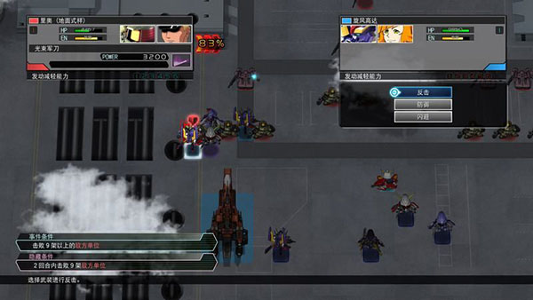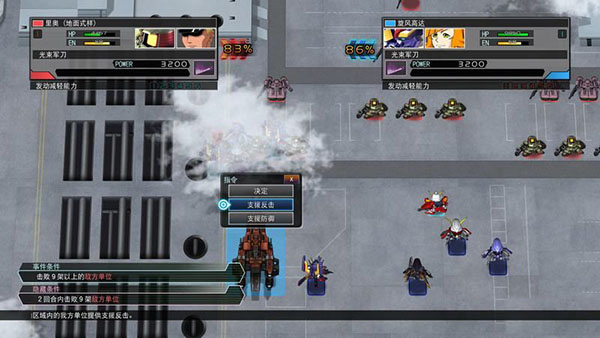 4、本关第二阶段,拖延游戏至第八回合,在剧情上掩护吉恩投降部队(可以绕着场地抻开敌方队伍,战舰比其MS还靠前,由玩家掂量是不是要交火)