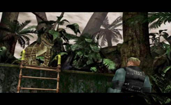 3、接著由水塔另一边的铁门来到『军事基地连络通路(1)』(※别忘了取得水塔上的回复剂),就可顺著通道来到『基地前区』的位置。进入基地前区后,会遇到霸王龙的袭击……由于此战无法取胜,因此需由地图左下的货柜处(※有扶梯可攀爬处)撤离,才能顺利进入『基地·主入口』。