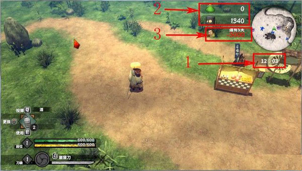 回到人界之后,右上角会多出一些UI,如下图箭头1所指,这里是时间提示,