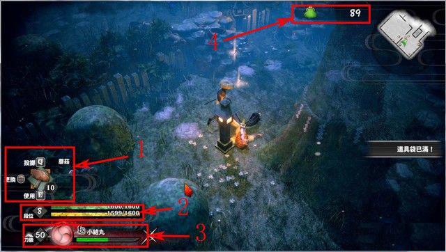 如下图箭头1所指,这里的道具栏位,游戏中的可拾取物品主要分为道具,材料,武器和装饰,