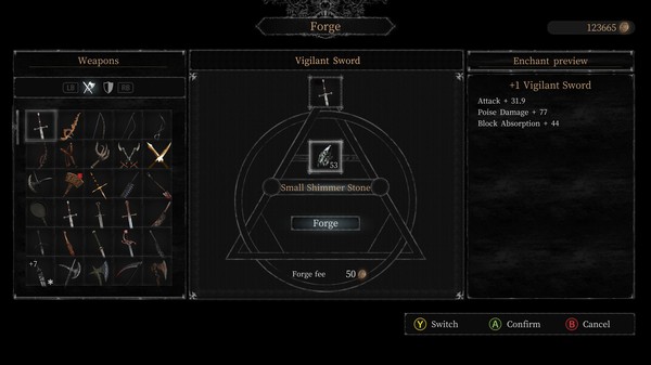 锻造需要金币和微光石来增加武器的等级,伪造武器的最高等级为+7,武器也可以通过锻造宝石来获得独特的增益效果。